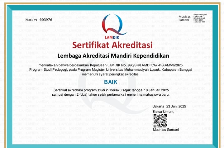 Program Studi Magister (S2) Pedagogi secara resmi meraih akreditasi dari Lembaga Akreditasi Mandiri Kependidikan (LAMDIK) dengan predikat Baik, berdasarkan SK Nomor: 990/SK/LAMDIK/Ak-PSB/M/VI/2025.